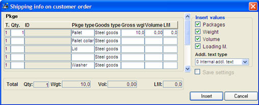 The result is presented in a separate window. By using the Insert button you can add package information as text rows to the invoice. Additional text type can also be selected in the same way as in the Text type field under the heading Extra Row Info for a text row (row type 4) on the invoice.