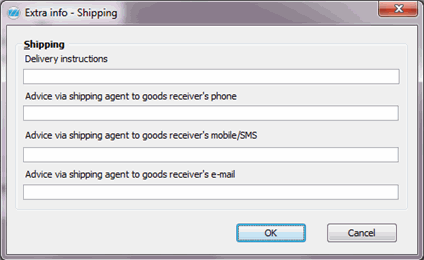 Here you can also enter a mobile phone number to the goods receiver in the Advice via shipping agent to goods receiver's mobile/SMS field. This number can be used by the shipping agent in order to phone or send an SMS when goods will be delivered. The mobile phone number will be included when printing shipping documents, if the source of info is Customer order / delivery or Delivery note.