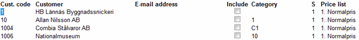 This list shows information about each customer, with columns for Customer code, Customer name, E-mail address (Main address or the reference person's address), Include, Category (customer category), S (customer status), and Price list.