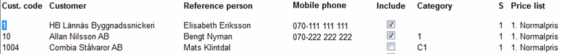 This list shows information about each customer, with columns for Customer code, Customer name, Reference, Mobile phone, Include, Category (customer category), S (customer status) and Price list.