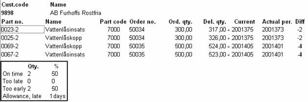The Log list shows all the delivery reported orders row for row. The Diff column indicates the difference between the current and the actual delivery period, where the current delivery period represents either the initial or current period (depending on your choice under the Create tab). Orders that are final delivered are marked with an asterisk after the delivered quantity. If the customer has own allowance for delivery reliability, the number of days that applies for customer will be shown at the bottom of the list.