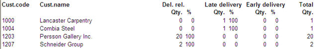 The Only total list shows a total of the rows, according to the classification option you selected under the Create tab. If you classify this list by part number, you would have a list showing which parts are often delivered too late. This list can then be used as a basis to update the safety time for these parts. Customers with a deviating allowance for on-time deliveries are marked with an asterisk.