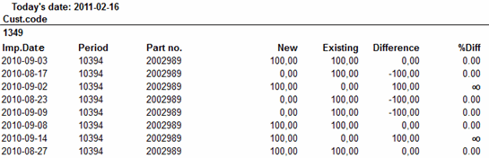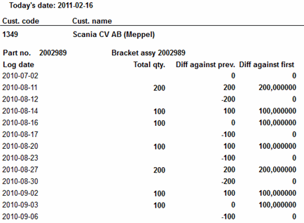 At the top of the Total per date/part list you will see today's date (when the list was created). Then you will see (per customer code and part number) Total quantity per log date (import date), the Difference in proportion to the previous import and the first import on all order rows of the imported delivery schedules.