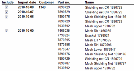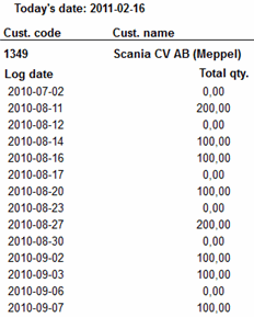 At the top of the Total per date list you will see today's date (when the list was created). Then you will see (per customer code) Total quantity per log date (import date) of all parts on all order rows in the imported delivery schedules.