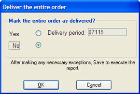 If you select No and OK, none of the order rows will be checked as delivered in full, and the cursor will be placed on the first order row.