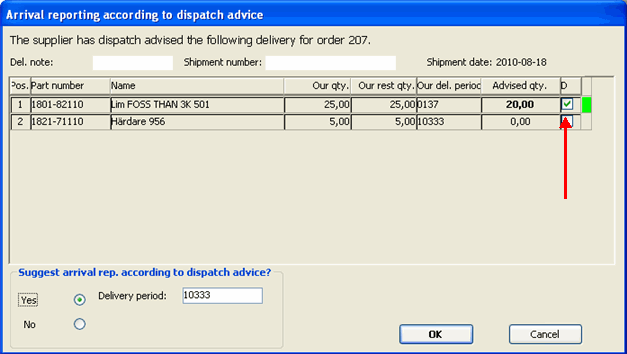 If you have selected to arrival report according to the dispatch advice you can only change the delivery period in this window. Do you need to change the values on the advised order rows? If you say No to the question Suggest arrival rep. according to dispatch advice? you can make changes in the regular arrival reporting window after you have closed this window by clicking OK.