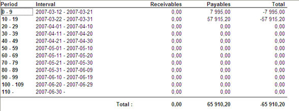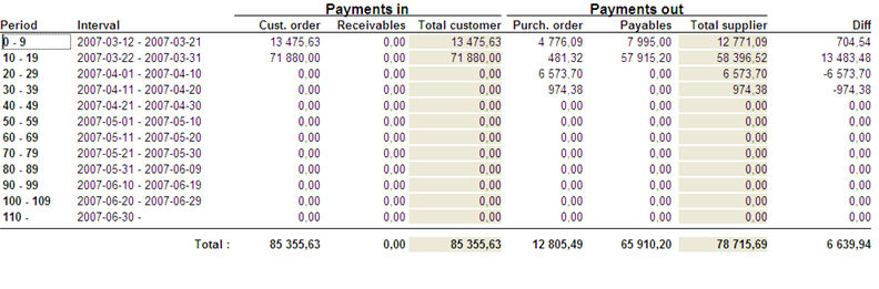 Below you will find two samples of the Total list, with and without order backlog. The period is per Day. The printouts contain information for each interval regarding the expected incoming payments, outgoing payments and the difference between these two. All these columns show a total at the bottom. If you have selected the setting Balance brought forward this will be shown in the list.