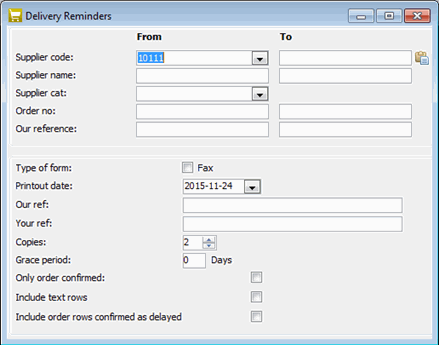 The available printout settings are Type of form, Printout date, Our reference, Your reference, Copies, Grace period, Only order confirmed, Include text rows and Include order rows confirmed as delayed.
