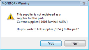 If you enter a part number that is not linked to the supplier in question a warning appears if the Setting Check supplier link during order registration? is activated under the Purchase tab. It is then possible to automatically add the supplier to the part's supplier link.