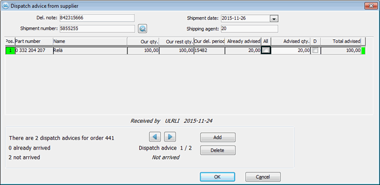 You can add dispatch advices by using the button Add and delete a saved one by using the button Delete. If you add a dispatch advice, you will only see order rows with a rest quantity. When deleting a dispatch advice a control question appears asking if you want to delete the selected dispatch advice.