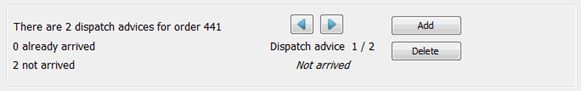 If one or several dispatch advices are saved on an order, you will see a pound sign (#) on the Dispatch Advice button. You will then see information in the dispatch advice window regarding who received and registered the dispatch advice as well as the date. You can see how many dispatch advices that are registered as well as how many are already arrival reported and not arrival reported. If there are more than one dispatch advice registered, arrow buttons are shown which can be used to navigate between the dispatch advices. The latest dispatch advice is shown initially and you can browse between the advices. The dispatch advices are sorted by Shipment date.