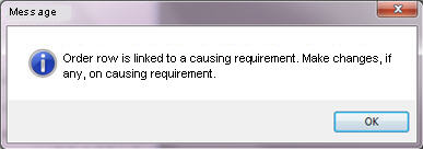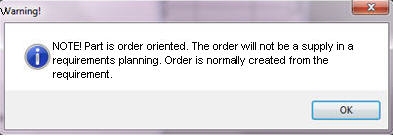During registration of a purchase order for a P-part with lot sizing rule Lot-for-lot and the setting Linked requirement/supply planning for P-part (Lot-for-lot) activated under the Requirements Planning heading under the Inventory tab in the Settings procedure, the following warning message will appear.