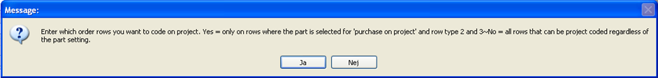 If you have activated the setting Manage purchase/manufacturing on project for parts, under the Inventory tab in the Settings procedure, the message below is shown when you enter a project number.