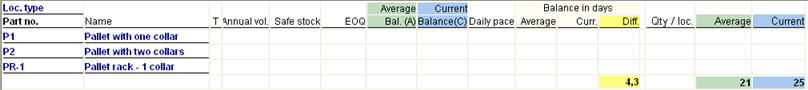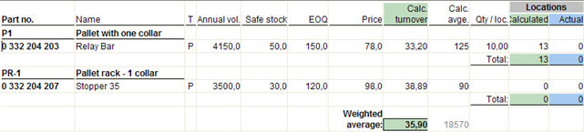In this list you can see different stock settings per part, quantity/location, average location requirement and the current location requirement.