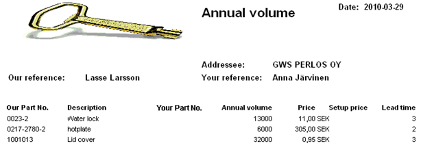 After that you will see Our part number, Name, Your part number, Annual volume, Price, Setup price (if any) and Lead time.