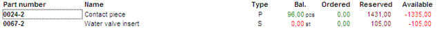 The Compact list shows the following for each part: Part type, Current balance, Unit*, total Ordered quantity, total Reserved quantity and Available balance. The available balance is shown in red font, if a shortage has occurred.