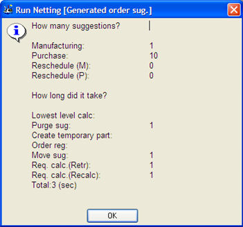 Once you start the run, each row in the selection will be requirement calculated and then be given a manufacturing order suggestion, if needed. After that, a requirement calculation will be performed for the underlying parts, and they will also receive suggestions. The netting run will review each row and place any necessary order suggestions and rescheduling suggestions for all the part levels in the selection.