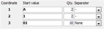 A coordinate can represent a house, a warehouse, a section, an aisle, a pallet rack, a level, a shelf, etc. You enter the form of the coordinate in the Start value column. Valid coordinates can contain digits (0-9, but nine digits in a row at the most) and letters (with exception of W, Å, Ä and Ö). You enter the number variants that should exist in the Quantity column.