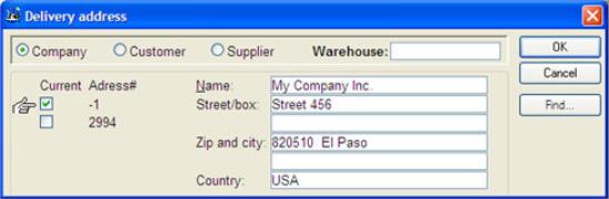 button to load a delivery address. You can select any delivery address that has been registered for the company, customers, suppliers and different warehouses. If you select "Customer" or "Supplier", a field appears for the customer or supplier code. You can there select any delivery address registered for the respective customer or supplier. You select the address in the left part of the window using the keys or by clicking in the box in question.