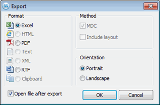 This procedure supports export of reports to a file. The file can be saved as a tab-separated text file or as an Excel file.