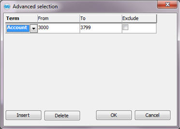 By using the button called A (Advanced selection) you can define several intervals of accounts, cost centers, cost units or projects for the same account row. This way you can determine that an account row should contain accounts 3000-3099 and 3500-3599 etc. You also have the opportunity to exclude one or several account intervals etc. for an account row by using the advanced selection.