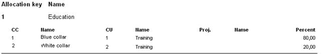 In the AutoAllocations list, the name of each basic account is shown. For the allocation accounts the account number, cost center, cost unit, project and percentage are shown. In the example below, the "Hire of equipment/tools" is allocated to the underlying cost center and cost unit according to the entered percentage.