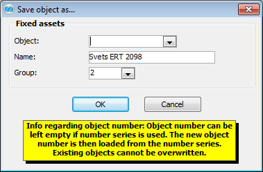 If you choose the alternative Save as... for a fixed asset in the fixed asset register, the following window will appear in which you enter the object number/code, name and group of the new fixed asset. If you leave the Object field empty, the next available number in the current number series will be set automatically (if applicable).