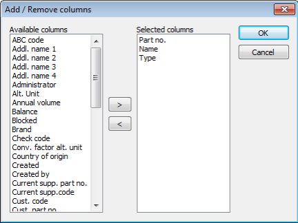 Here you can choose not to show duplicate rows in the search result. Such duplicate rows can occur under certain circumstances, for example when searching for a part number that has several customer links and the customer's part number and our part number is the same. (E.g. a customer that is registered with a separate customer code for each geographic unit but the customer's different units share the same part register.)