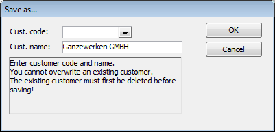 Please Note! You cannot use Save as... and select an existing customer/supplier number without first deleting that customer/supplier. If you try to overwrite an existing customer or supplier, a message appears.
