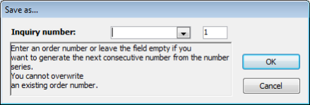 If you choose the alternative Save as... for a record in the inquiry register, the following window will appear, in which you can enter the inquiry number for the new inquiry. If you leave this field empty, the next available inquiry number in the current inquiry number series will be set.