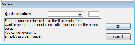 If you choose the alternative Save as... for a record in the quote register, the following window will appear, in which you can enter the quote number for the new quote. If you leave this field empty, the next available quote number in the current quote number series will be used.