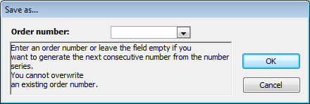 If you choose the alternative Save as... for a record in an order and invoice register, the following window will appear, in which you can enter an order number for the new order/invoice. If you leave this field empty, the next available order number in the current order number series will be used.