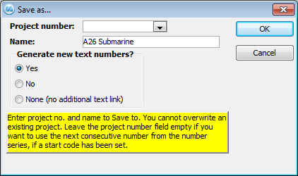 If you choose the alternative Save as... for a record in the project register, the following window will appear, in which you must enter the project number and a name for the new project.