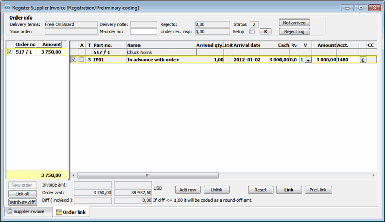 If you press the Cancel button above, no basis is created but the usual checks to see if the order has been arrival reported are performed. If you click Release above, an invoice basis is created from the selected row. This invoice basis is then displayed under the Order link tab (marked to be linked to the invoice).