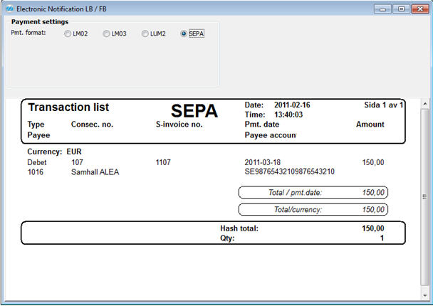 After you have executed the payment suggestion, the Electronic Notification LB/FB procedure will open. Under Payment settings, select Payment method SEPA. Then you print the list. After printout you are asked if a payment file is to be created. If you answer Yes, the file is created in the directory that you entered on the EDI link in the EDI Links procedure.