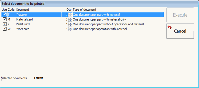 Here you enter or select which manufacturing order documents you want to print. By default, the documents that were entered in the Manufacturing Order Documents procedure in the Global Settings module are entered here, but can be changed temporarily. By entering a quantity after the document's code, you can print several copies of the documents. For example, if a traveler has the code T, enter T3 to print 3 copies of the traveler.