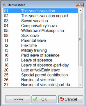 - An Automatic absence check can be performed for the employee when clocking-out using the "Out" option. If the clocking-out takes place within the so-called "core time" or basic working hours, then the absence must be registered via the Absence codes window. An absence record is created from the start of clock-out up to the end of regular working hours. The employee can also enter a Comment for the absence recording. This comment can then be seen in the Recording List procedure.