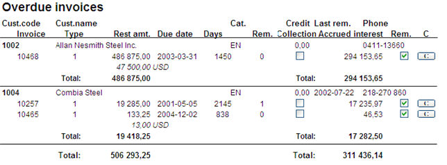 This list contains information about the customer, and all the invoice information for this customer's overdue invoices. The list shows how many days have passed since the due date and how much interest has been generated. To the left of the Type column you will see if it is an Advance invoice, Supplier invoice or Subsequent invoice.