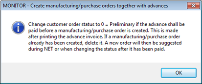 When in advance invoices are paid in either the Register Incoming Payments, Incoming Payment List or Confirm Incoming Payments procedures a message appears informing you that the customer order status must be changed manually to 1 so that linked manufacturing/purchase orders can be created.