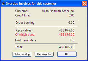 warning if there are any overdue invoices for the customer in question. The warning appears when the customer is loaded into the customer field. From the warning window you can directly display the order back log and accounts receivable due for the customer.