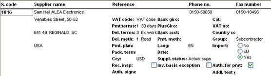 The Contact info list shows the same information as the Standard list, plus all the References, Phone and Fax information including comments. The Comments field is very small, compared to the original input field in the Update Supplier procedure, to allow it to fit in the list.