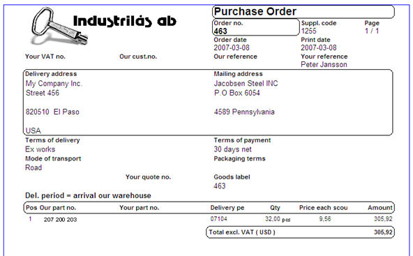 Here you will see a printout sample of how a purchase order printout may look like when printed via a printer.