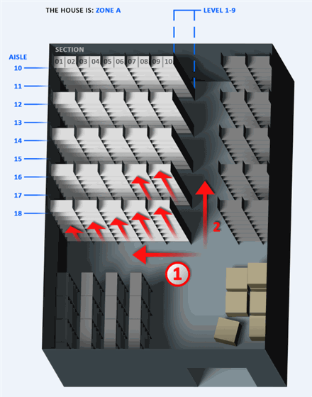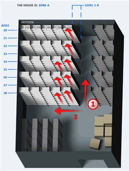 Example 2: The stock is filled per section from the nearest section. The stock storage starts with the Section in the nearest Aisle. Every Section is filled from floor Level.