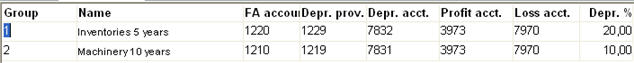 It is possible to update name, fixed asset account, depreciation provision, depreciation account, profit account, loss account and depreciation percent in all of the lists.
