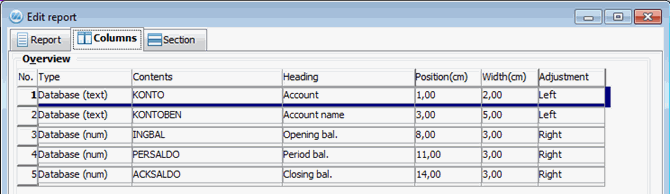 Here you enter of which columns the report should consist horizontally. Depending on which column type you select, different database fields can be loaded and calculations can be made among them. By right-clicking you can copy/paste columns. The tab mainly consists of two sections. The top section is called Overview: