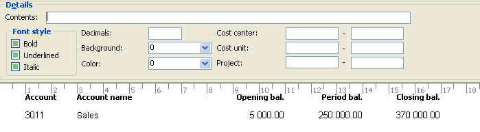 At the very bottom of the Details section you can see a preview of the report's column layout. The columns are here displayed with the column headings, column positions and column widths that have been entered for each column in the Overview section. A ruler graded in centimeters is shown above the column headings.