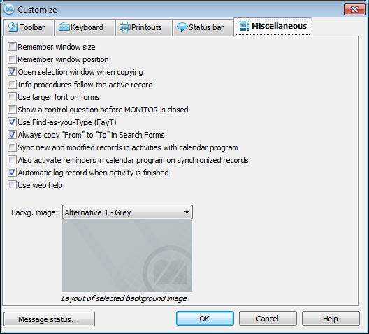 - Backg. image - here you can select your background image in MONITOR. There are seven available background images to choose from, plus the alternative "No background image". In the latter case you will see a medium grey background color which matches the other colors in MONITOR. By using different background images in each company (if you have more than one) you can easily see in which company database you are working at the moment. It is especially useful if you have several companies open at the same time in separate windows. In MONITOR Basic the only available options are to not use a background image or to use the MONITOR Basic's background image.