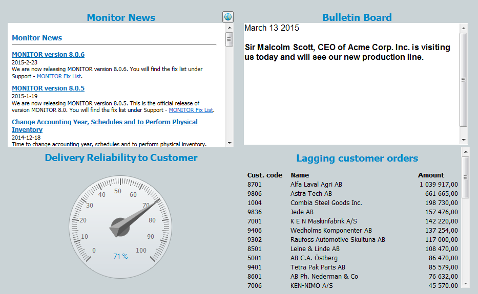 start page is the first you will see in the program window when starting MONITOR. The start page contains different components and you will quickly see relevant information adapted to you or to the user group which you belong. The start page is displayed when the program window is empty and also when all procedure windows are minimized.