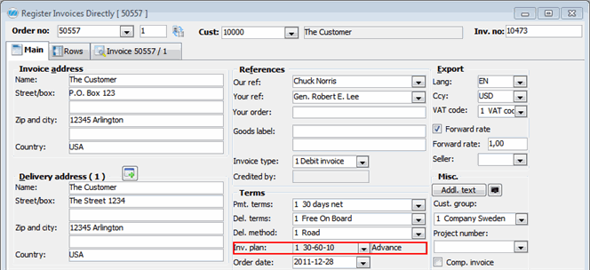 It is not possible to manually register a new partial invoice of e.g. the Advance type in Register invoices directly. These must be created either under the Invoicing plan tab in the Register Customer Order procedure or from the Standard list in the Invoicing Plan List procedure or when delivering a customer order.
