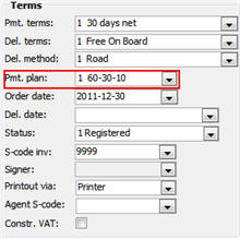 Under the Main tab the Payment plan field is found, where you choose if the order is to be invoiced according to a payment plan, or not.